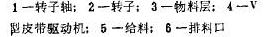 外壳是焊接在垂直方向定位的转子轴上的圆形焊接结构件。在轴的上端有转子及其磨损板。在转子区内,外壳设计能使天然物料层起到冲击环的作用。转子轴由位于下端的水平安装的V型皮带驱动轮驱动。以衬板保护的外壳盖安装在转子上方,它装有风道和给料管。外壳的下部有两个开口,物料破碎后由此排出。结构简图图下。